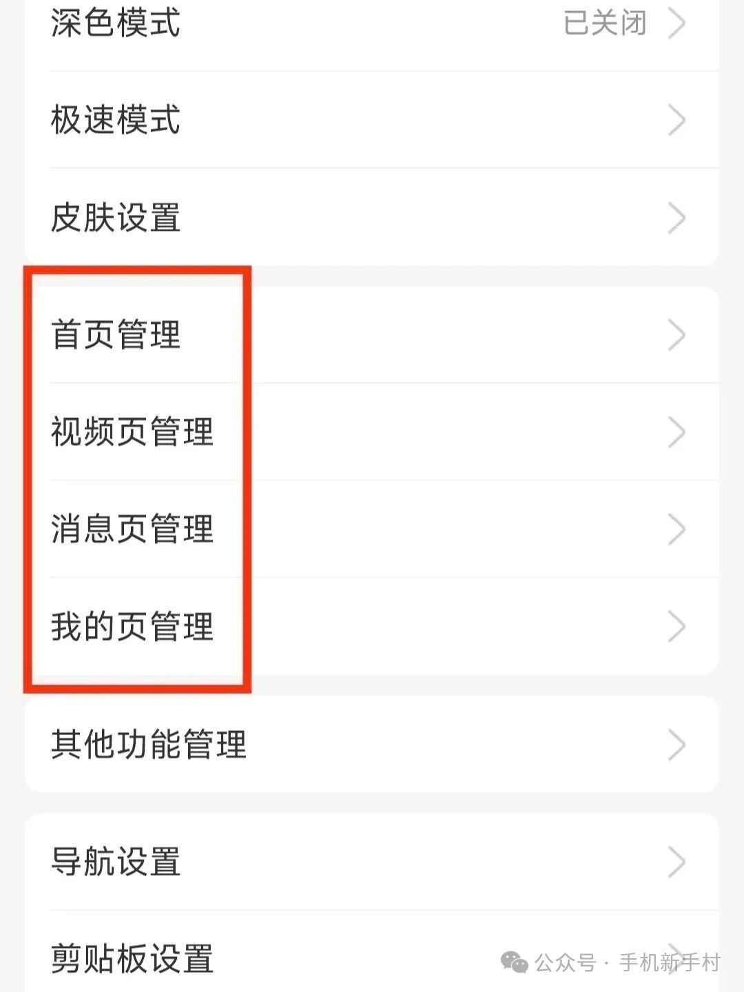 ▫️ 视频管理:直接关闭「视频」选项,底部栏的短视频入口就消失啦(不刷视频的宝子必关!)。