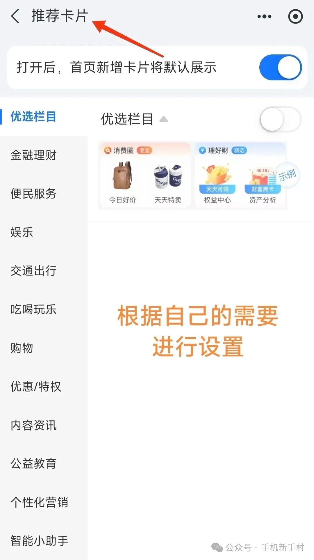 ▫️ 首页管理:关闭「活动氛围图」「应用动态提醒」「优选栏目」「智能场景服务」;再点击【推荐卡片】,按需勾选首页下方显示的卡片,多余的统统隐藏。