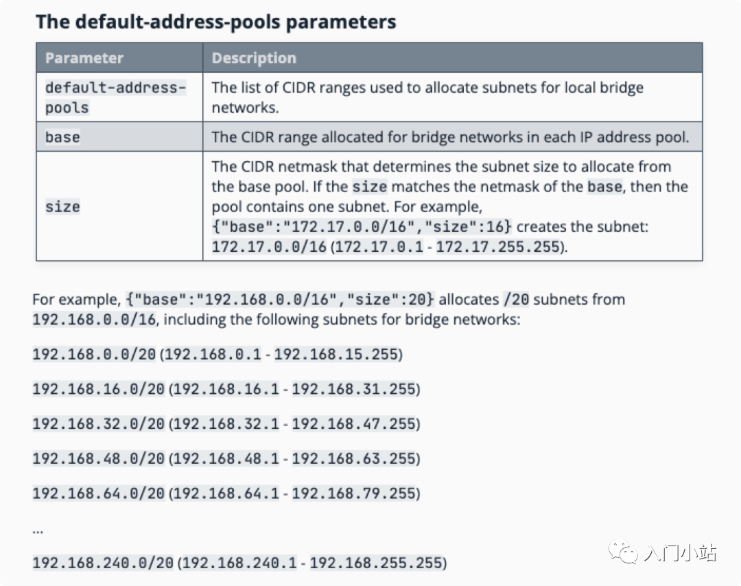 "default-address-pools":[{"base":"10.210.200.0/24","size":28}]}其中,base 告诉我们划分子网的网段是什么(从来开始),是从前两位(/16)开始,还是第三位开始(/24)呢?而 size 则告诉我们划分的每个子网有多少 IP 地址可以使用呢?从 "10.210.200.0/24" 我们可以知道,该网络下面只有 254 个可用的 IP 地址(直接使用肯定不够),然后我们需要给 docker 使用,划分每个子网可用 16 个 IP 地址,所以子网就应该写成 28 了。