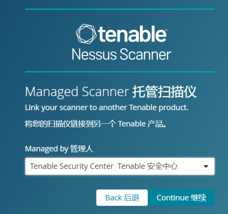 重点:Register offline,选择“Managed Scanner”, 再选择 “Tenable security center”,最后一步设置账号密码,账号密码没要求。