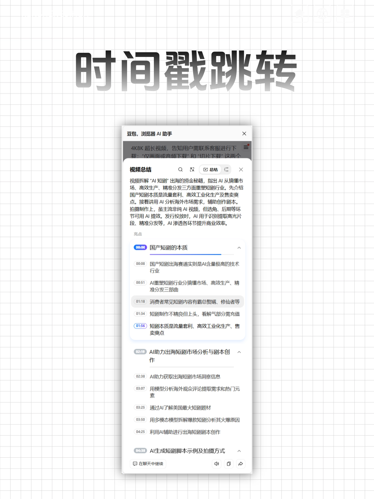 生成视频总结有时间戳,能精确降落在自己想看的时间点,还能生成脑图,搜索视频内容等。