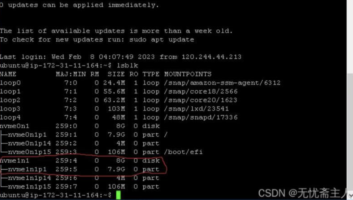 可用看到一个未挂接的磁盘(nvme1n1),可以通过磁盘大小来区分是不是原来服务器上的磁盘,mountpoints 为空的就是没有挂载。