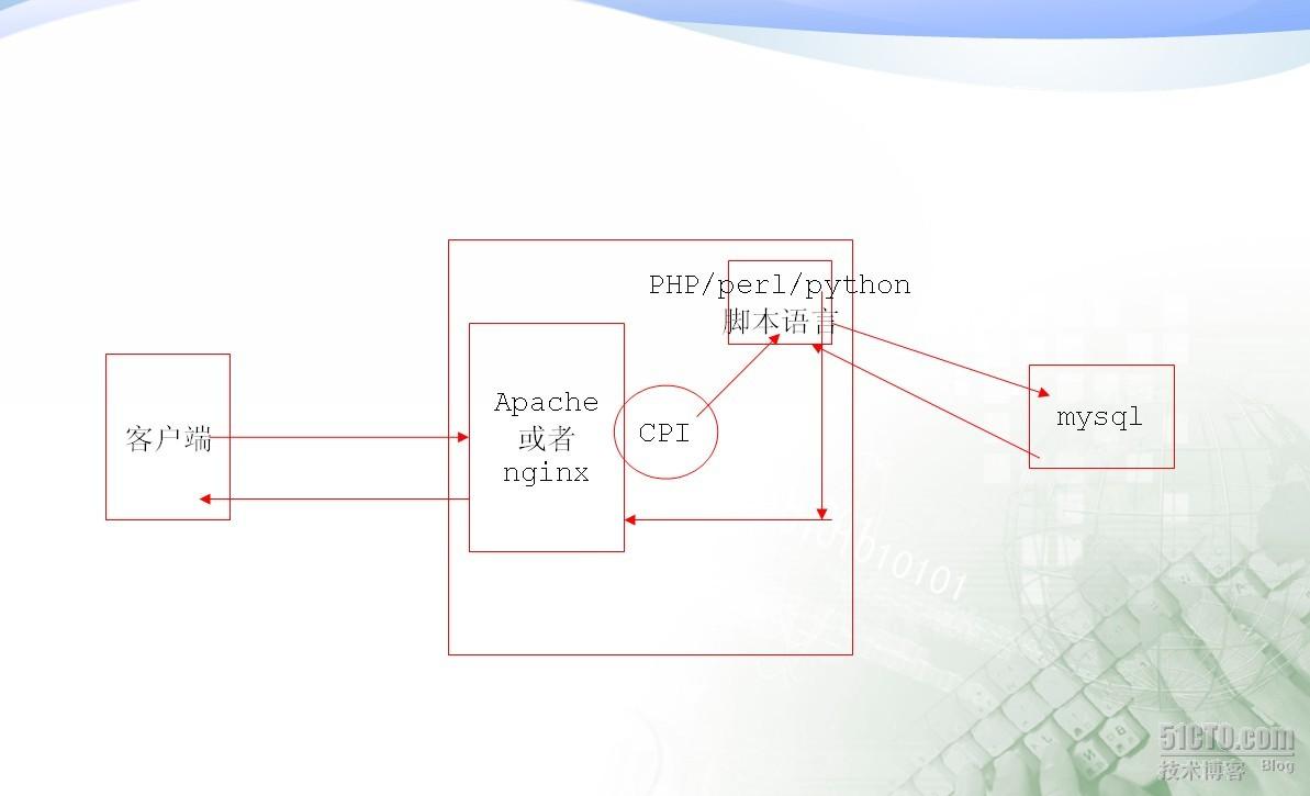 客户端在访问动态页面时,因为apache和nginx只能提供静态解析,这是他们通过内置的cgi接口去寻找php等脚本语言,当需要用到数据部分时PHP会去调用后台MYSQL数据库中的数据,之后通过解析生成静态页面在返回apache/nginx服务器,再由此交付给客户端。 如果不清楚CGI和fastCGI笔者作以下简要说明: Perl、Python或者PHP原来在Web开发的时候应用得比较多,因为早期的web服务器(当然还包括Apache)内建了CGI(通用网关接口)接口。CGI能够以确定的方式让Web服务器在客户机的浏览器和外部应用程序之间交换数据。通过支持外部的、基于CGI的应用程序,Web开发人员能够引进动态要素。使用这种接口开发经过编译的应用程序相对来说比较复杂,但是,这种解释性的语言通常包括这种功能,或者是直接包括这种功能(如使用PHP),或者通过标准模块包括这种功能(如使用Perl和Python)。FastCGI同CGI一样是一个WEB服务器与外部程序接口的标准,它是为解决CGI的性能问题而开发的一种技术。CGI技术的性能缺陷:每当服务器收到一个对CGI程序请求时,服务器都将创建一个CGI程序的进程,CGI程序处理完请求后,将输出发给服务器或直接传回客户端,然后终止。 fastCGI对CGI技术进行了改良,一个fastCGI进程在WEB服务器启动时或在客户端第一次请求时创建,它处理完客户端请求后并不终止,而是等待处理下一个请求。另外fastCGI程序与CGI程序与服务器的交互方式也不同,CGI程序通过环境变量、命令行、标准输入输出进行交互,因此CGI程序进程必须与服务器进程在同一台物理计算机上,而fastCGI程序与服务器进程通过网络连接交互,因此fastCGI程序可以分布在不同的计算机上,这不但可以提高性能,同时也提高了系统的扩展能力。