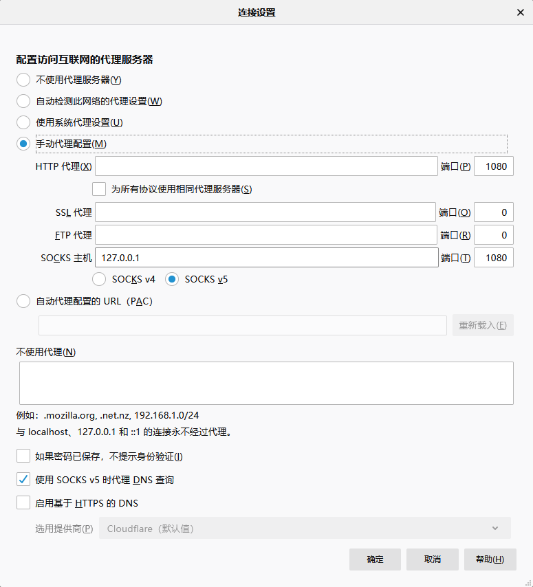 注意代理方式只选择 sock 5 代理,因为强大的 GFW 具有 DNS 污染功能,所以把”使用SOCK v5 时代理 DNS 查询”选项也钩选上,经测试钩选此项后效果提升明显,不会出现被屏蔽网站无响应情况。