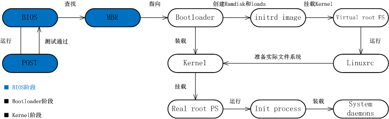 在 Kernel 阶段,Kernel根据 linuxrc 的结果来挂载真正的文件系统
