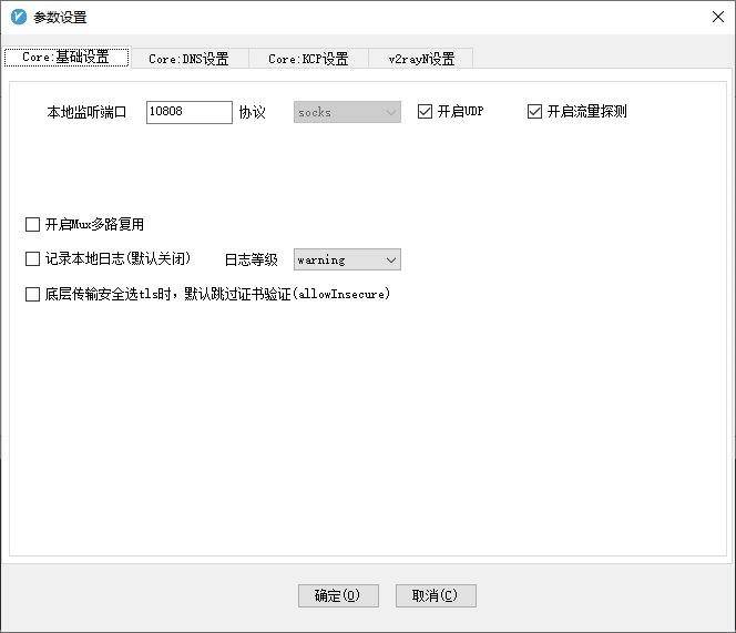 Socks 服务器的设置就比较简单,一个是服务器的 IP 地址,另一个是服务器侦听的端口。如果以 v2rayN 作为 Socks 服务器,则可以在参数设置的”Core:基础设置”查看与设置,默认使用 10808: