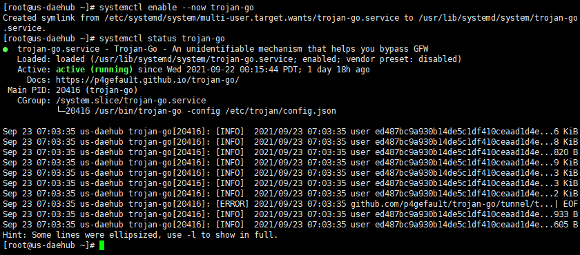 # systemctl enable --now trojan-go # systemctl status trojan-go
