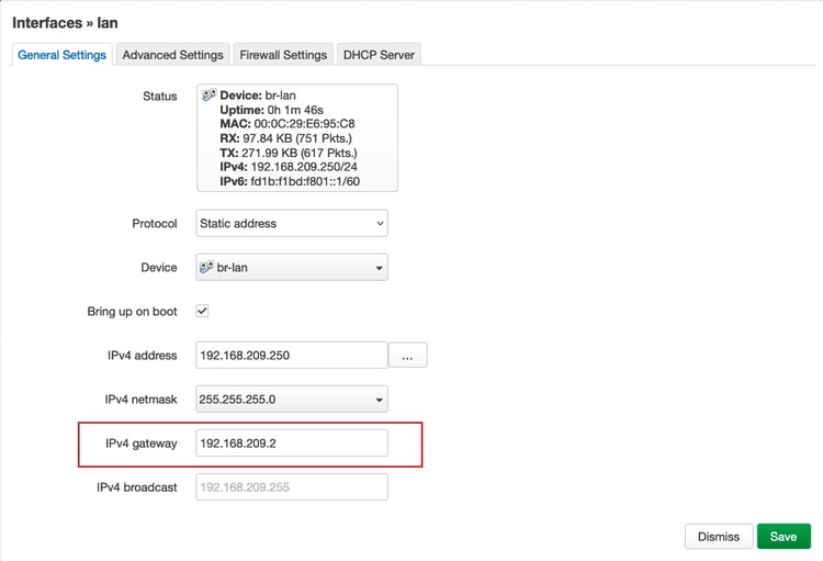 首先将虚拟机的网络适配器更改为桥接模式,OpenWrt 虚拟机网络地址配置为局域网内的一个可用 IP 地址,例如示例使用 192.168.9.254,修改 OpenWrt 网络接口的网关为局域网内互联网网关地址,修改 dns 服务器为实际可用 dns 服务器,保证 openwrt 虚拟机及 passwall 插件可正常使用并且测试通过。