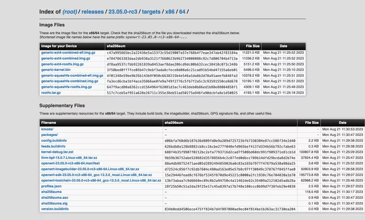 进入 OpenWrt 的 >>官方网站<<,点击 Downloads 进入下载页面,点击 Stable Release builds 进入固件选择页面,选择 23.05-rc3 -> targets 进入固件下载页面,之后会出现固件所支持的架构列表,由于本次演示使用的是 x86 虚拟机,则选择进入 x86/64/ 目录进入最终固件下载页面: