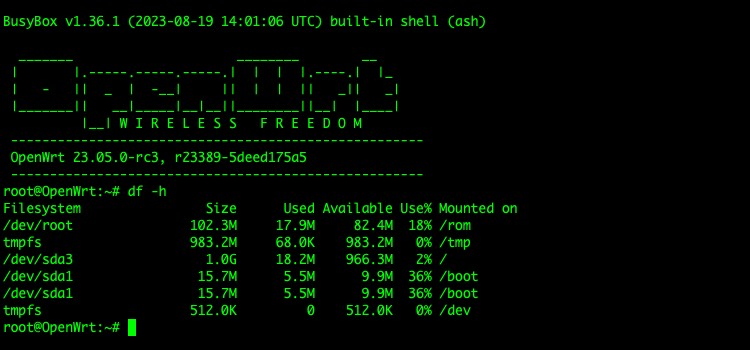 再次启动虚拟机,查看分区挂载情况,如图所示,系统根分区已经成功挂载到扩展的磁盘空间,表示 OpenWrt 系统根分区扩展完成。