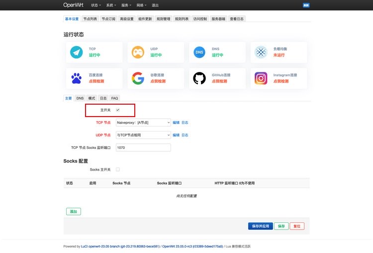 最后,进入基本设置选项卡,钩选主开关后面的点选框,之后点击保存并应用,就会启动 passwall 插件: