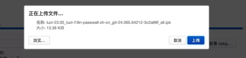 点击”上传软件包…”按钮,就会弹窗提示选择需要上传的软件包(即 ipk 文件),点击”浏览”选择最新版的 Passwall 软件包,然后再点击”上传”按钮,就会将软件包上传至 OpenWrt 主机: