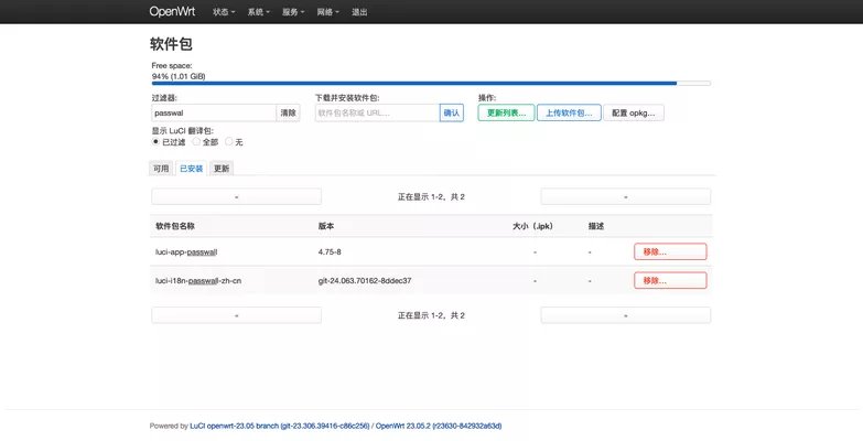图.2 OpenWrt 软件包管理工具显示 Passwall 信息