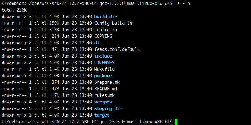 $ wget https://downloads.openwrt.org/releases/24.10.2/targets/x86/64/openwrt-sdk-24.10.2-x86-64_gcc-13.3.0_musl.Linux-x86_64.tar.zst $ apt-get install zstd $ tar -I zstd -xvf openwrt-sdk-24.10.2-x86-64_gcc-13.3.0_musl.Linux-x86_64.tar.zst $ cd openwrt-sdk-24.10.2-x86-64_gcc-13.3.0_musl.Linux-x86_64/