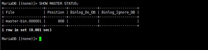 MariaDB [(none)]> CREATE USER 'slave'@'localhost' IDENTIFIED BY 'slave'; MariaDB [(none)]> GRANT REPLICATION SLAVE ON *.* TO slave IDENTIFIED BY 'slave' WITH GRANT OPTION; MariaDB [(none)]> FLUSH PRIVILEGES; MariaDB [(none)]> FLUSH TABLES WITH READ LOCK; MariaDB [(none)]> SHOW MASTER STATUS;