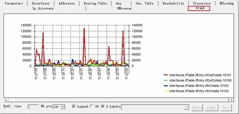 接下来切换到Graph标签卡,点击Strat后示波器哦不,端口流量趋势图就来了,需要注意的是,Getif不能自定义单位,毕竟是免费的,抓到的数据单位是字节,需要自己转换,当然你也可以通过趋势图直观的感受下各个端口的流量: