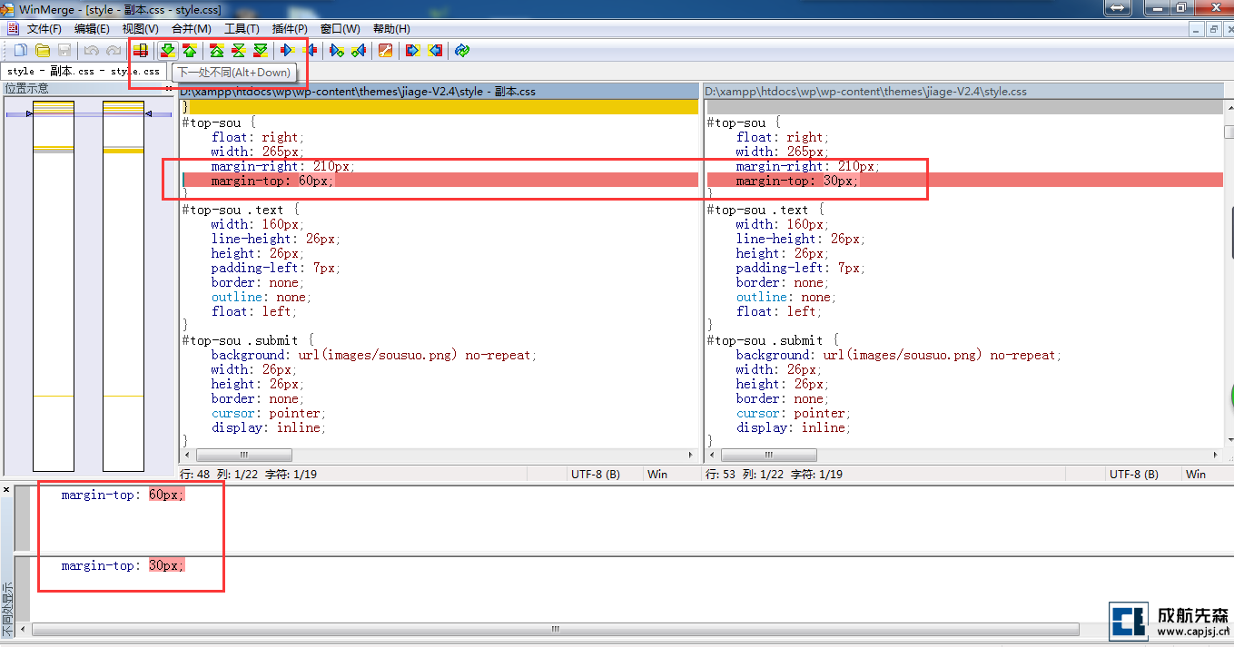 这样一来,先森就有点懵逼了,因为服务器上的改动小,根本不记得改动了哪里,手动的找的话实在有点过于麻烦了。这个时候,WinMerge就帮了先森大忙了。先森将本地的style.css压缩后再格式化,再将服务器上的style.css格式化,使两个文件格式相同后,再用WinMerge一对比,增加了什么代码,删除了什么代码就一目了然了。