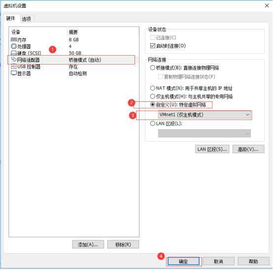 9、网络适配器–>自定义(U):特定虚拟网络–>选择“虚拟网卡”–>确定