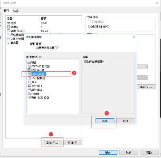 10、添加虚拟网卡(建议为三个) 添加–>网络适配器–>完成–>自定义(U):特定虚拟网络–>选择“虚拟网卡”–>确定