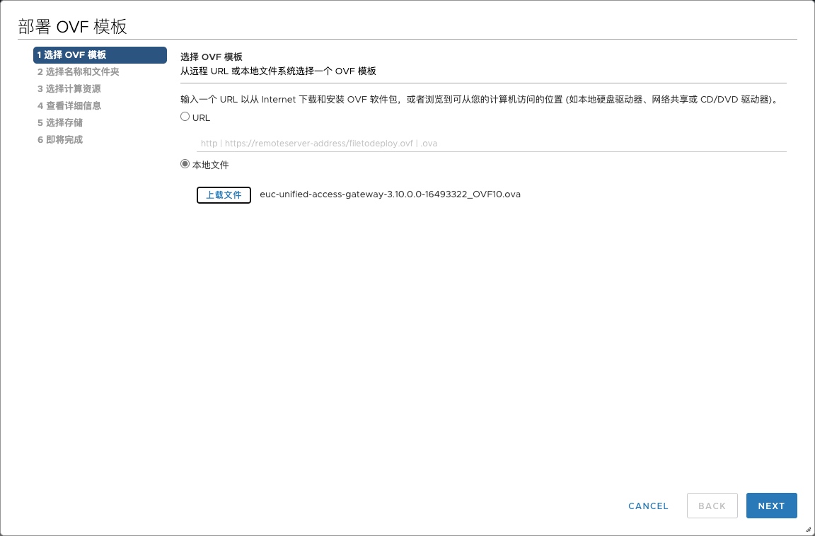 选择本地文件,选择下载好的euc-unified-access-gateway-3.10.0.0-16493322_OVF10.ova文件,点击下一步