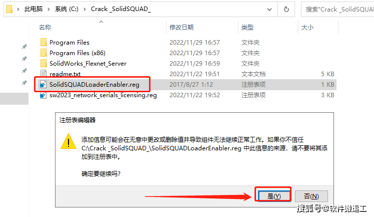6、后退Crack _SolidSQUAD_文件夹,双击运行sw2023_network_serials_licensing.reg,然后点击是