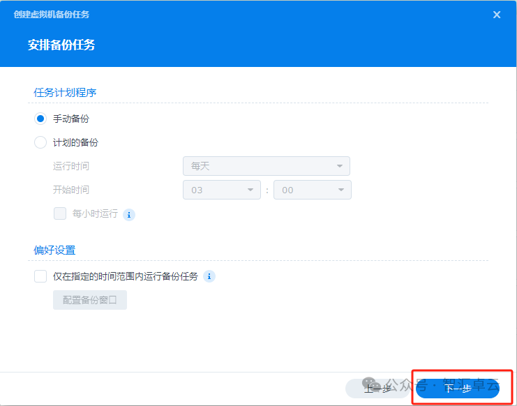 7、设置备份任务,因为我这里只是实验环境,所以就选择手动备份了,若是真实环境建议根据需求设置自动备份。 11、点击“完成”后会提示是否立即备份,你可以立即备份也可以后续手动执行备份。我这里就直接立即备份了。
