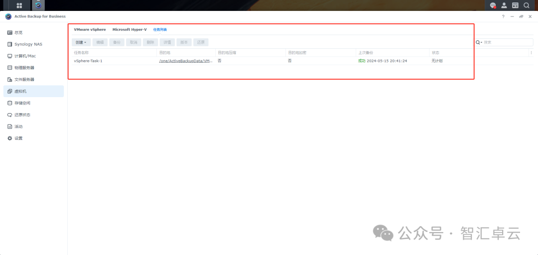 1、首先你可以在任务列表找到备份任务点击上面的还原。 2、除此之外还可以,在对接的Hypervisors这里找到相应的虚拟机,点击还原。4、选择还原平台,这里可以还原到微软的Hyper-V和群晖的VMM。我这里因为没有配置其他的平台所以就一vSphere演示。 6、选择还原模式,这里可以还原到原位置或者选择还原到“还原到新位置或使用不同配置”,第二种可以选择不同的Hypervisor(可以理解为不同的vSphere环境)以及计算、存储、网络资源。 7、确认还原信息,点击完成。这里还可以选择还原后开机。 9、点击确定后可以到“还原状态”选项卡查看还原状态。