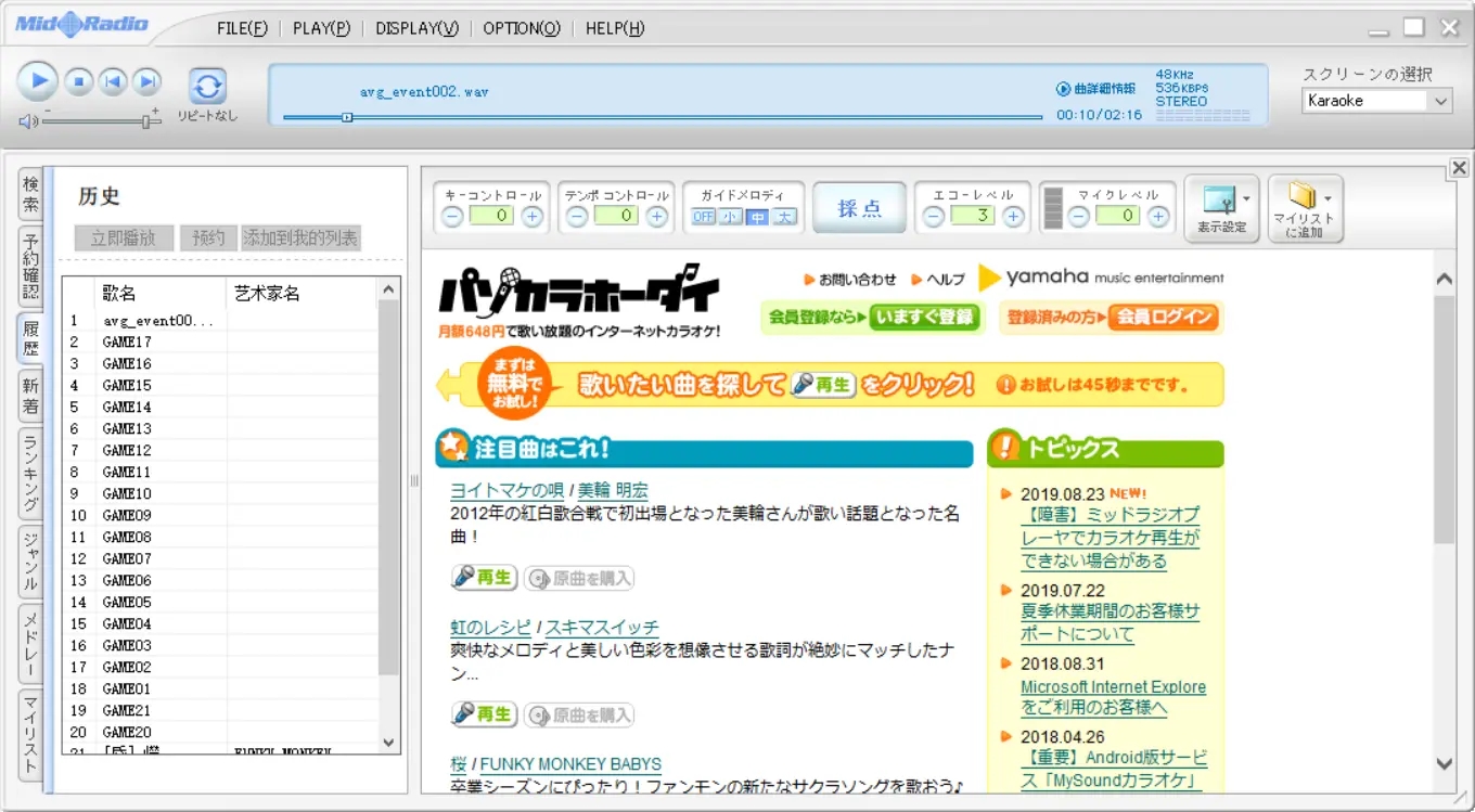 那么……是不是就没办法了?当然有,现在雅马哈还有提供一个播放软件MidRadio Player可以用。该软件本意其实是为了雅马哈自己的一个日本卡拉OK网站服务,但是因为它可以实现本地播放,那么我们就可以用它来播放自己的音乐文件。该播放器因为自带一个S-YXG2006LE软波表,因此播放MIDI音乐出来的效果并非系统自带那么差劲,甚至可以说是目前可以找到的YAMAHA已发布的软波表的最高版本。至于以前经常用的S-YXG50?那个自从WinXP之后就不能用了,官方也早已放弃维护;而更早的S-YXG100,这个虽然是雅马哈官方发布的已知效果最好的软波表,但……支持系统仅到Win9x为止。