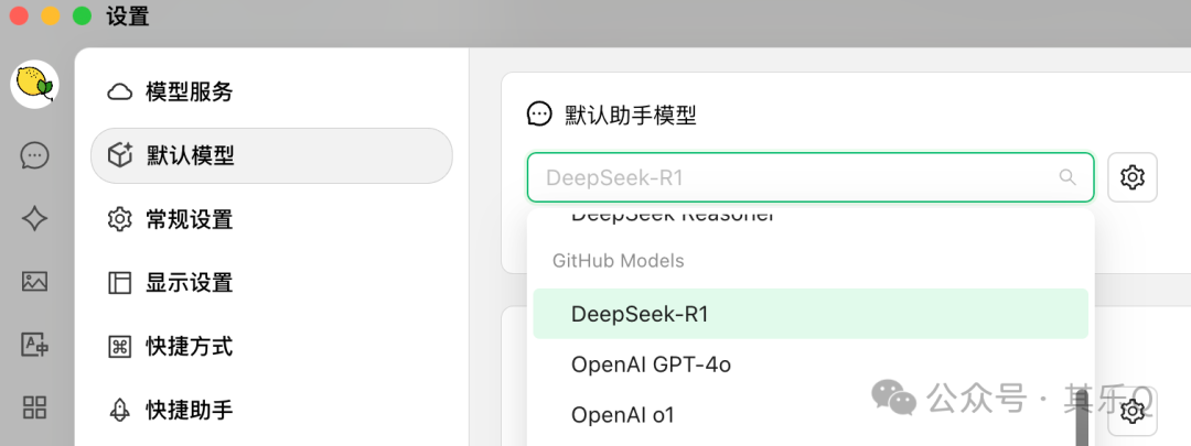 配置 Cherry Studio Cherry Studio支持主流大模型服务,配置过程也基本相似,这里我说下几个常用模型服务的配置过程。 你可以根据自己的需求配置,建议多配置几个模型服务,这样在不同聊天窗口中可以使用不同的模型服务。 我自己通过 DeepSeek、Github model、OpenRouter 这三个模型,让 Cherry Studio 同时免费支持 DeepSeek、Gemini、GPT-4o 等几个大语言模型。 配置 DeepSeek 模型服务 首先点击左下角的“设置”按钮,然后点击“模型服务”,接着点击“深度求索”,打开 https://platform.deepseek.com/api_keys 页面,创建 API key 后,复制到 Cherry Studio 的 “API 密钥” 处,再点击 “检查”。 在弹出的对话框中选择 “DeepSeek Reasoner”,点击“确定”。 配置完成后,点击右上角的开启按钮开启 DeepSeek。 配置 OpenRouter 模型服务 首先我们在浏览器中打开 https://openrouter.ai/ 登录,如果没有账号的话,可以注册一个。 输入名称,点击 Create 创建 Key。 然后点击复制按钮。 回到 Cherry Studio,我们把复制的 Key 粘贴到 “API 密钥” 处,然后向下滚动到底,点击“管理”。 我们只需要点击右侧的+号,就可以把自己想用的服务添加到配置中。 免费服务有次数限制,一段时间频繁使用的话会提示超过限制次数了。如果你本来用的就少,使用免费的就行了。 配置完成后,同样点击右上角的“开启”按钮开启 OpenRouter 服务。 配置 Github models 模型服务 前面我们提到过 Github 提供了一些免费的大语言模型,如 DeepSeek R1、GPT-4o 等,对于国内无法使用 OpenAI 服务的人来说,Github model 是个不错的方案。 首先我们打开 https://github.com/marketplace/models ,翻到下面可以看到 OpenAI GPT-4o 和 DeepSeek-R1 等几个模型。 我们随便点击一个大语言模型,如 OpenAI GPT-4o,然后会跳到该模型的对话框。 接着点击 “Use this mode” 去创建 Key。 在弹出的对话框中点击 "Get developer key"。 点击 "Generate new token",选择第一个 "Generate new token"。 填写 Token name 和有效期,然后点击 "Generate token"。 点击复制按钮,将其粘贴到 Cherry Stuido 的 “API 密钥” 处。 然后点击“添加”,模型 ID 输出 DeepSeek-R1,点击“添加模型”。 然后点击“检查”,根据自己的需求选择模型,然后点击右上角的“开启”按钮开启 Github models。 其他模型服务的配置大致和这三个都差不多,你可以根据自己的需求自行配置。 设置默认模型 Cherry Studio 支持不同的对话使用不同的模型,我们可以设置默认的模型。 点击设置 -> 默认模型,定义默认助手模型,我这里配置的是 DeepSeek-R1。 Cherry Studio 助手 配置完成后,我们就可以开始使用 Cherry Studio 啦。 我们可以根据不同的需求创建不同的助手,比如翻译助手、图表助手、写作助手、八卦小王子等各种各样你想要的需求。 点击聊天图标,点击“添加助手”,输入助手名,点击“新建”创建助手。
