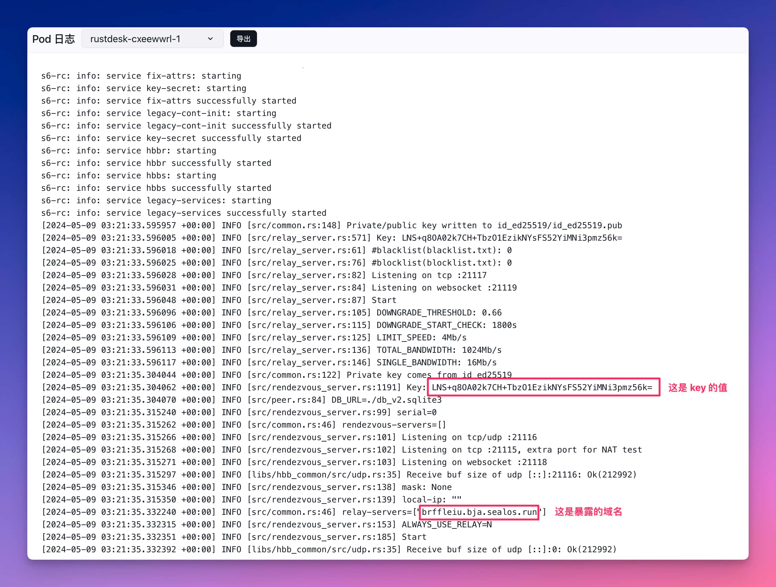 日志中可以找到两个关键信息:外网域名和公钥。后面需要用到。