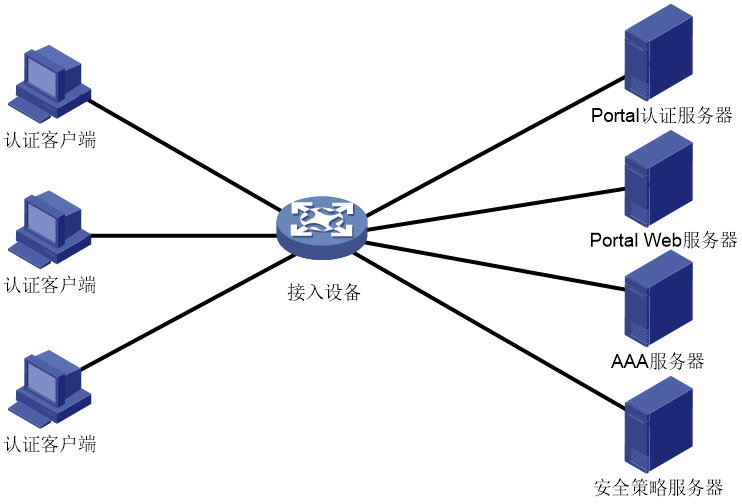 如图1-1所示,Portal系统通常由如下实体组成:认证客户端、接入设备、Portal认证服务器、Portal Web服务器、AAA服务器和安全策略服务器。