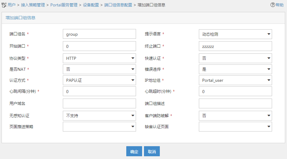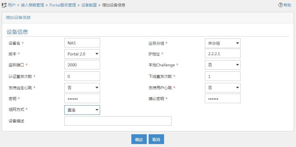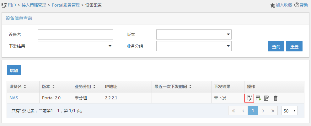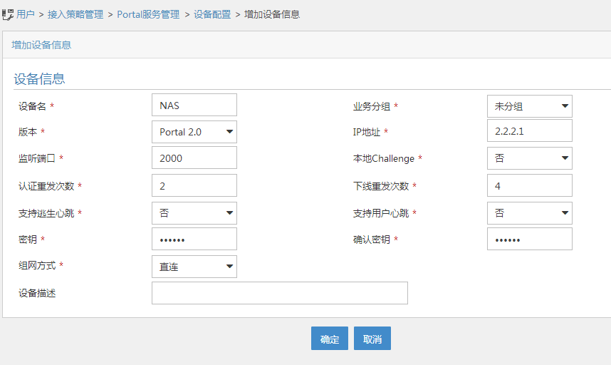 选择“用户”页签,单击导航树中的“接入策略管理> Portal服务管理 > 设备配置”菜单项,进入设备配置页面,在该页面中单击<增加>按钮,进入增加设备信息配置页面。