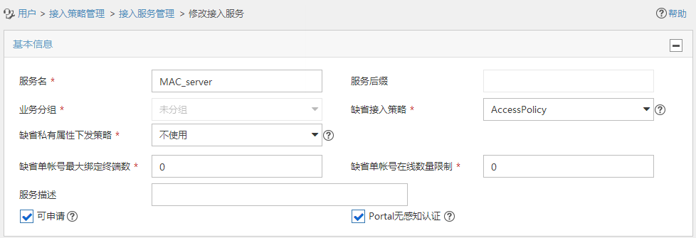“非智能终端Portal无感知认证”可根据实际需要启用或禁用,本例中为启用。