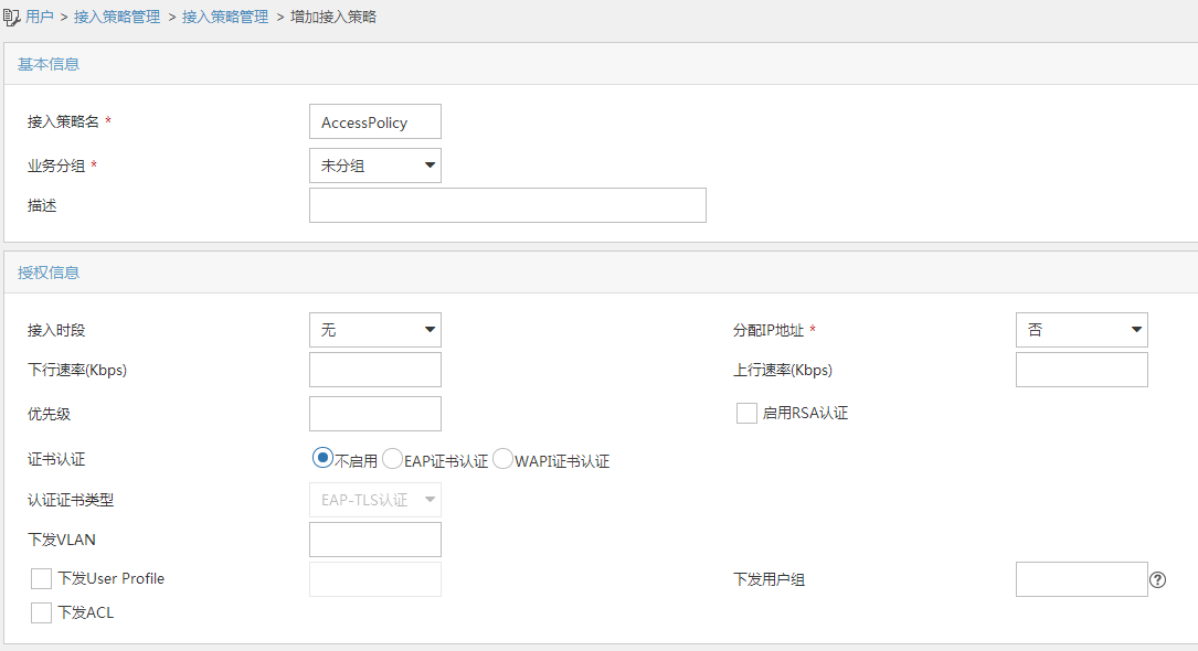 单击导航树中的[接入策略管理/接入策略管理]菜单项,并点击<增加>按钮,进入“增加接入策略”页面。