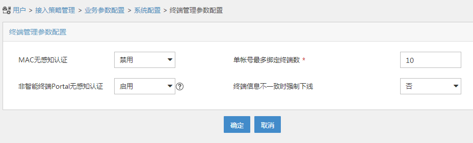 单击导航树中的[接入策略管理/业务参数配置/系统配置]菜单项,并点击[终端管理参数配置]对应的<配置>按钮,进入终端管理参数配置页面。