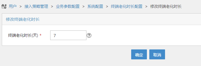 单击导航树中的[接入策略管理/业务参数配置/系统配置]菜单项,点击[终端老化时长]对应的<配置>按钮后点击<修改>,进入终端老化时长配置页面。