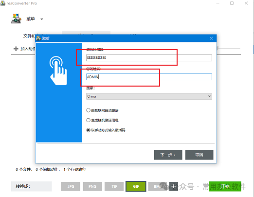 7、在注册码和姓名中随意输入信息;然后勾选以手动方式输入激活码,如图