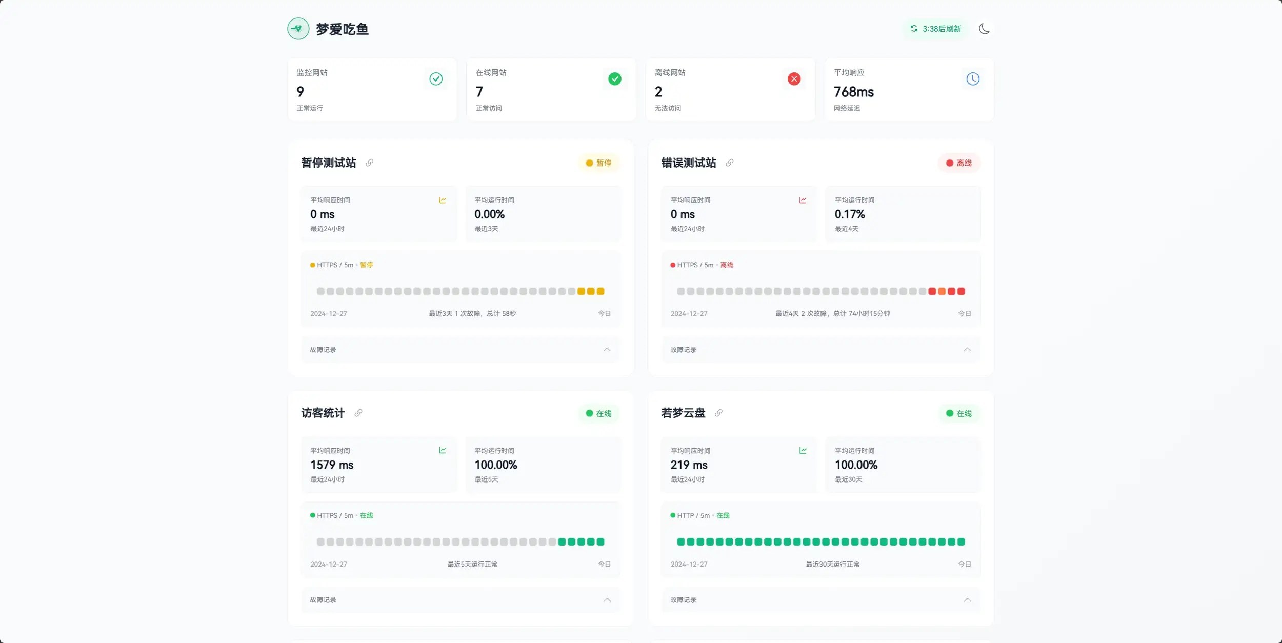 ? 实时监控:支持多种监控方式 ? 响应式设计:适配移动端和桌面端 ? 主题切换:支持亮色/暗色主题 ? 数据统计:可视化展示可用率和响应时间 ? 故障记录:详细的宕机记录和原因分析 ? 自动刷新:定时自动更新监控数据 ? 平滑动画:流畅的用户界面交互体验