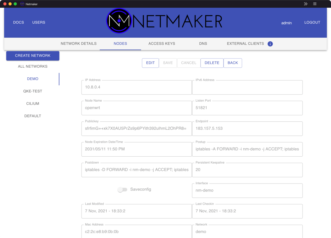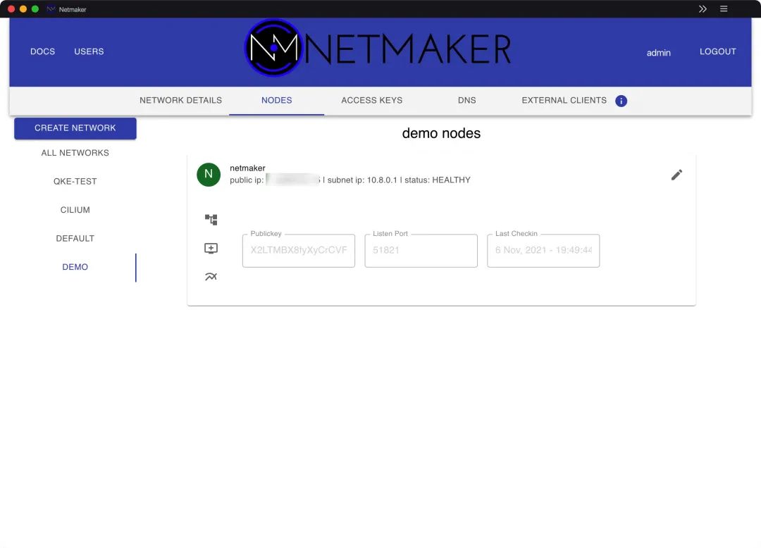 如果部署 Netmaker 时开启了环境变量 CLIENT_MODE: "on",Netmaker 就会将自身所在的主机也作为一个网络节点,名字默认为 netmaker。