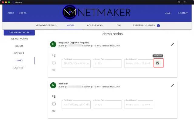 再到 Netmaker UI 中批准加入节点的请求,批准之后就可以看到各个节点之间已经握手成功了。