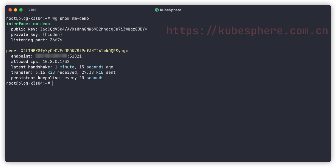 $ wginterface: nm-demo public key: sfrfimG++xk7X0AU5PrZs9p6PYith392ulhmL2OhPR8= private key: (hidden) listening port: 42655peer: Z6oCQdV5k4/AVXsUhhGNW69D2hnqcgJe7i3w8qzGJBY= endpoint: 103.61.37.238:55730 allowed ips: 10.8.0.2/32 latest handshake: 5 seconds ago transfer: 488 B received, 1.39 KiB sent persistent keepalive: every 20 secondspeer: X2LTMBX8fyXyCrCVFcJMDKVBtPcfJHT24lwkQQRSykg= endpoint: 121.36.134.95:51821 allowed ips: 10.8.0.1/32 latest handshake: 7 seconds ago transfer: 568 B received, 488 B sent persistent keepalive: every 20 secondspeer: 2sGnrXTY1xb+cWMR+ZXfBLZqmpDtYCNtKdQ3Cm6gBAs= endpoint: 192.168.100.90:57183 allowed ips: 10.8.0.3/32 latest handshake: 1 minute, 35 seconds ago transfer: 1.38 KiB received, 3.46 KiB sent persistent keepalive: every 20 seconds