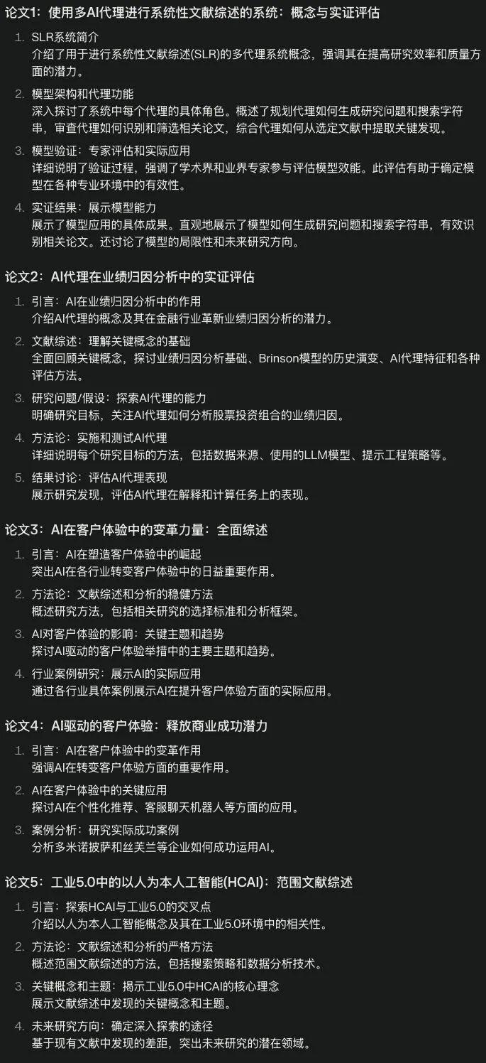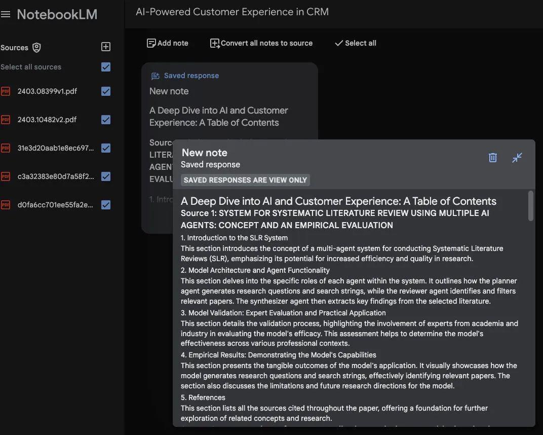 将可以下载的论文全部下载下来,为了演示方便,这里只用了其中五篇。上传五篇论文后,让NotebookLLM输出目录。
