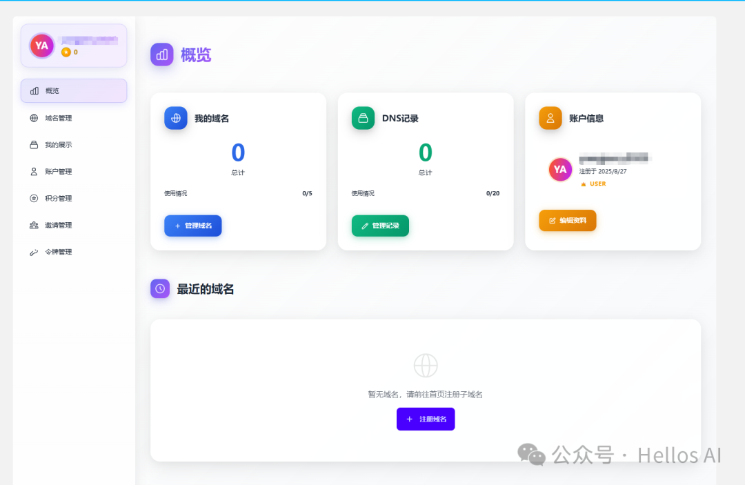 到这里我们就到个人看板了,这里可以管理我个人的所有数据,接着我可以进入下一步来注册域名啦! 三、注册域名 在个人详情页面中点击页面底部的"注册域名"按钮,进入如下的页面