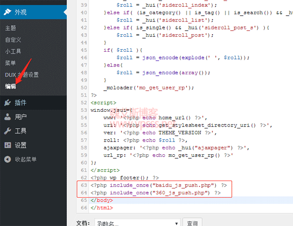 考虑到网页加载速度,这个 php 文件最好在</body>的前面添加,这样网页文件都加载完毕了之后再加载这 2 个 js 文件,不会拖慢网页打开速度,让用户体验更好。具体操作进入 wordpress 后台的外观-编辑,找到页脚文件,也就是 footer.php(或者 ftp 连接到 VPS 下载 wordpress 模板的 footer.php 文件到本地修改后上传),把百度和 360(360 站长工具)的这两个 php 文件添加进去,保存。前台刷新网页看源代码里面有没有相关的代码,如果能找到就说明成功了。
