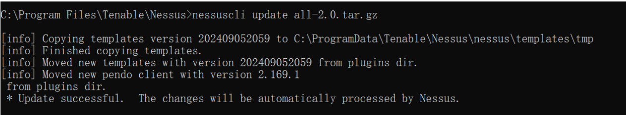 attrib -s -r -h "C:\ProgramData\Tenable\Nessus\nessus\plugins\*.*" attrib -s -r -h "C:\ProgramData\Tenable\Nessus\nessus\plugin_feed_info.inc" .\nessuscli.exe fetch --register-offline "C:\ProgramData\Tenable\Nessus\nessus\nessus.license" .\nessuscli.exe update C:\ProgramData\Tenable\Nessus\nessus\all-2.0.tar.gz