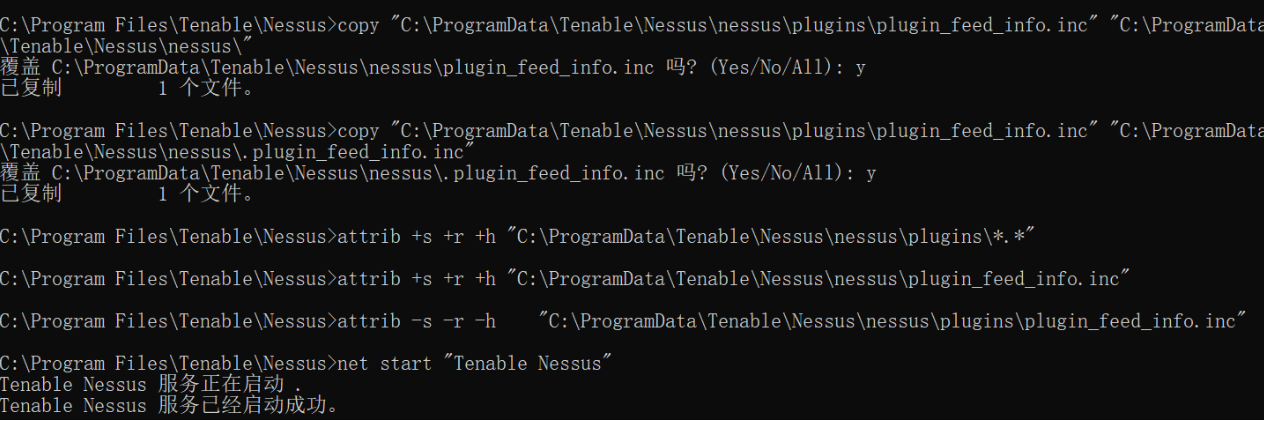 copy "C:\ProgramData\Tenable\Nessus\nessus\plugins\plugin_feed_info.inc" "C:\ProgramData\Tenable\Nessus\nessus\" copy "C:\ProgramData\Tenable\Nessus\nessus\plugins\plugin_feed_info.inc" "C:\ProgramData\Tenable\Nessus\nessus\.plugin_feed_info.inc" attrib +s +r +h "C:\ProgramData\Tenable\Nessus\nessus\plugins\*.*" attrib +s +r +h "C:\ProgramData\Tenable\Nessus\nessus\plugin_feed_info.inc" attrib -s -r -h "C:\ProgramData\Tenable\Nessus\nessus\plugins\plugin_feed_info.inc" net start "Tenable Nessus"