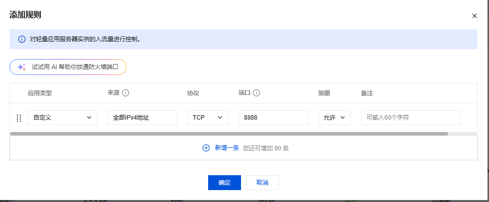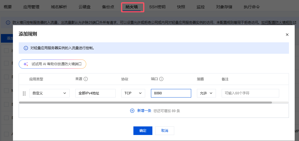 轻量服务器的防火墙需要放通 8888 端口,这是宝塔面板的默认端口,若不放开此端口,后续将无法正常打开宝塔面板进行相关操作。