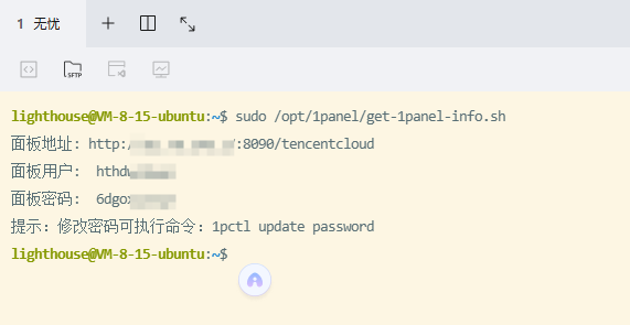获取面板初始的管理员账号,密码,跟上面宝塔面板的一样,复制命令,免密码登录终端,运行即可!