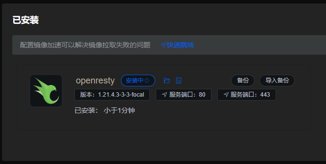 我们首先需要安装OpenResty,这是为了用作反代,因为docker安装的应用一般都带着端口,所以我们需要反代一下,实现免端口访问,这样看起来美观一些~