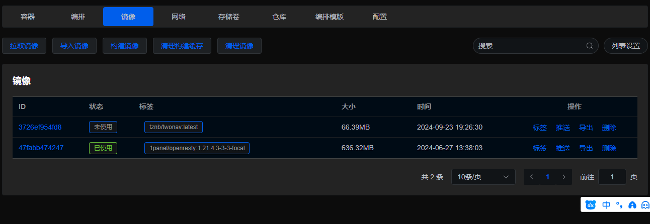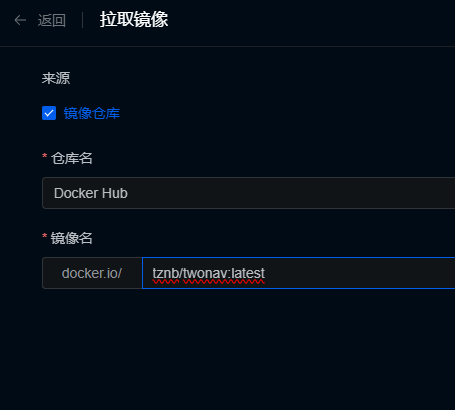 左边菜单,点击容器---镜像---拉取镜像。输入tznb/twonav:latest 开始拉取